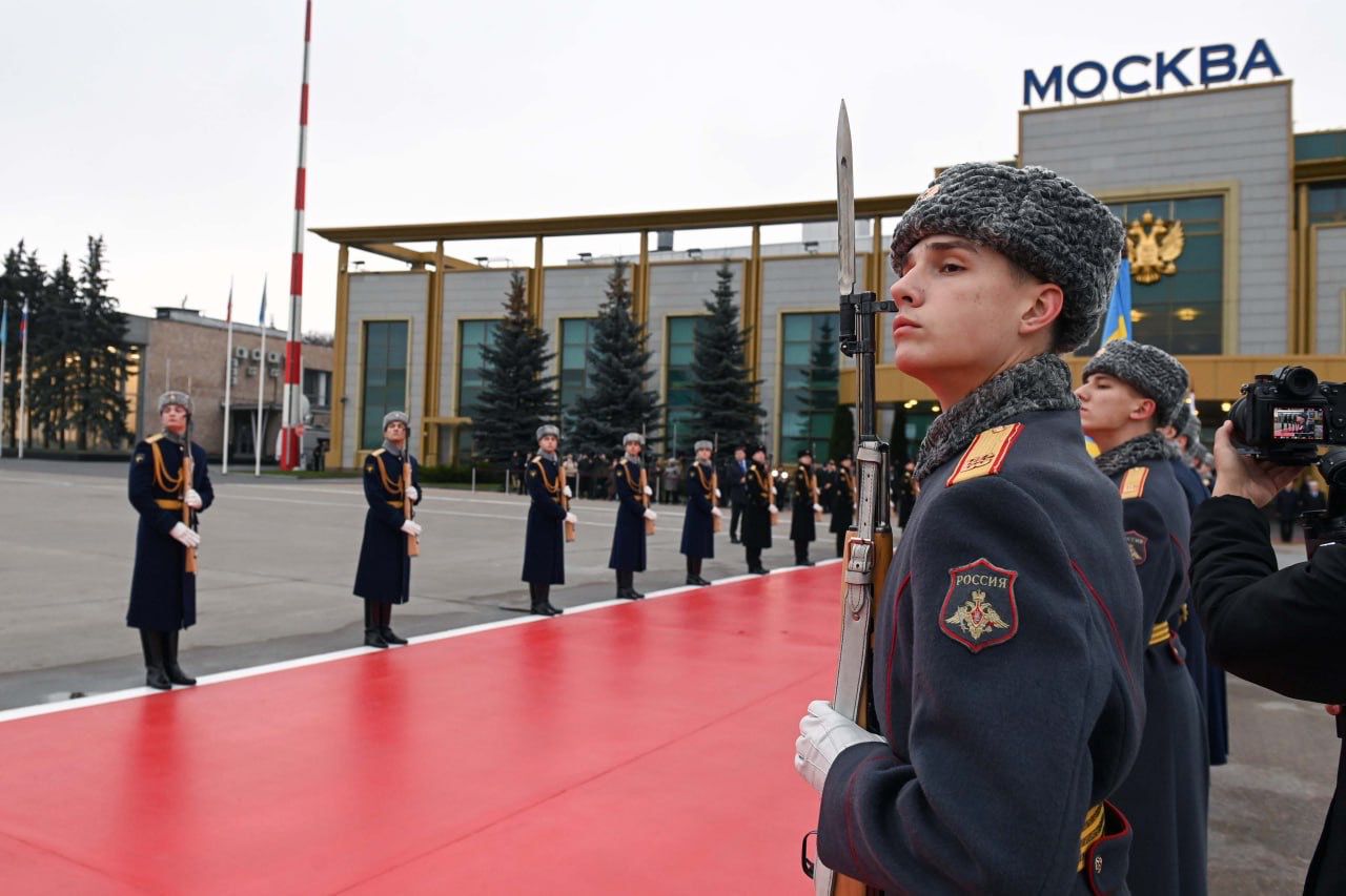 Внуково-2 әуежайында мәртебелі мейманның келуіне орай Мәскеу гарнизонының құрмет қарауылы мен әскери үрмелі оркестрі сап түзеді.